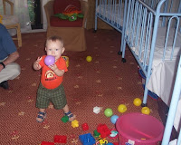 i am learning to color, mostly i like sorting the crayons but i can scribble a bit and daddy has been teaching me to dance. hopefully we will get a good video of that. (Videos and pics are difficult at times bc i see the camera and want to play with it and stop doing whatever it is mommy and daddy are trying to record for you out there-so we aplogize for the not so great videos but hopefully you can still enjoy his stepping stones) i am learning to use the spoon and feed myself and say "All Done" in sign language. One thing that is really sweet about me is "giving love"; if you say Jo give "Mommy/Daddy/any person or stuffed animal" love then i will go over to them and rub them gently. We love this new skill!